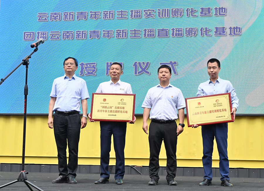活動(dòng)現(xiàn)場(chǎng),共青團(tuán)云南省委黨組成員、副書記趙攀峰,云南廣播電視臺(tái)黨委委員、紀(jì)委書記曹渭海為云南紡織(集團(tuán))股份有限公司、云南天度投資集團(tuán)有限公司頒發(fā)了“團(tuán)播云南”直播基地、云南新青年新主播直播基地牌匾。