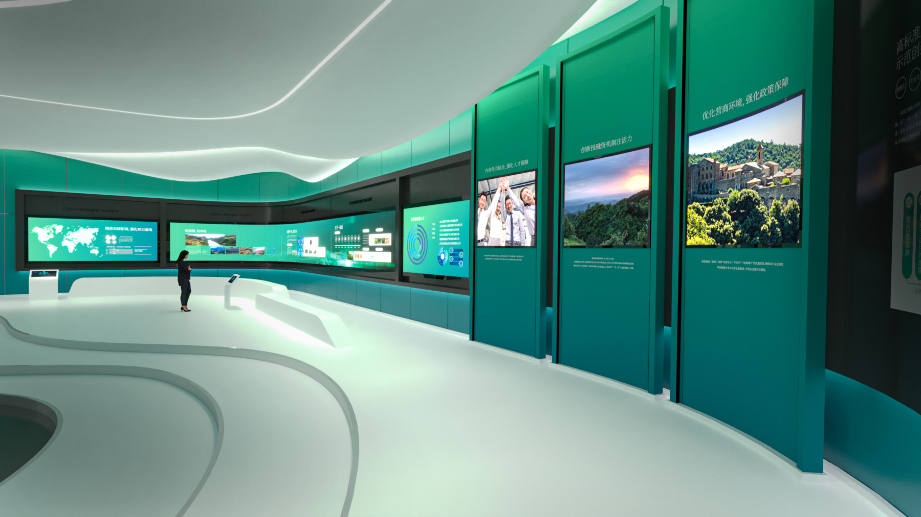天度集團擁有專業(yè)的展廳展館主題策劃、內(nèi)容制作、硬件集成、場館設計及施工團隊,以多媒體和數(shù)字化技術作為展示技術、最新的影視動畫技術,結合獨到的圖形數(shù)字和多媒體技術,實現(xiàn)人機交互方式的展廳形式,集各種多媒體展覽展示系統(tǒng)為一體的綜合展示平臺,包括數(shù)字沙盤、環(huán)幕/弧幕/球幕影廳、迎賓地幕系統(tǒng)、互動吧臺、虛擬漫游、LED拼接屏、互動鏡面及觸摸屏等實現(xiàn)數(shù)字化展廳一站式解決、實施方案。